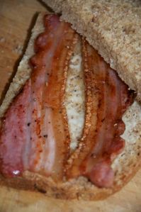 Now enjoy! Slice as thinly as possible (I recommend keeping the the ‘edge’ slice for cutting into lardons and cooking with, as it can be uneven in shape and will be saltier than the rest of the piece) with a very sharp knife, put a couple of slices into a hot frying pan, and wait for the sizzle! You can cut the rind off before or after cooking, but I wouldn’t! The fact the fat was scored on the piece will stop the rind deforming the bacon as it cooks.