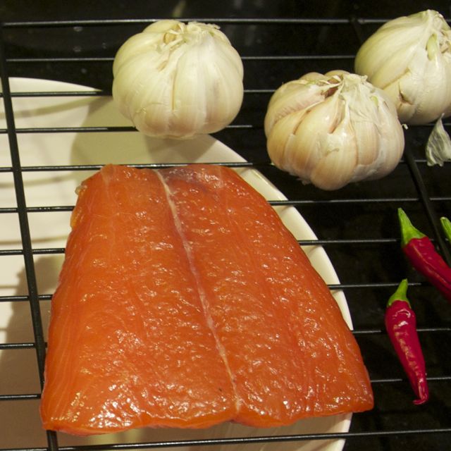 • In a dry frying pan, start to cook your whole smoked salmon fillet