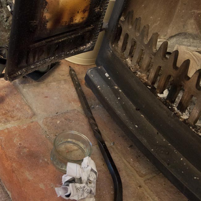 Scrunch up about half a sheet of newspaper. Dip it in the water and squeeze out the excess. Then dip it into the ash. Now use this, gently, to rub the glass. You should notice it working straight away, which is very gratifying. The water and ash forms a really fine abrasive slurry, which lifts the soot from the glass with very little effort. When the paper starts to get really black and stops working again, get a new piece, and repeat the process as often as required. Getting both doors of my fire cleaned took about half an hour. They’re *sparkling*.
