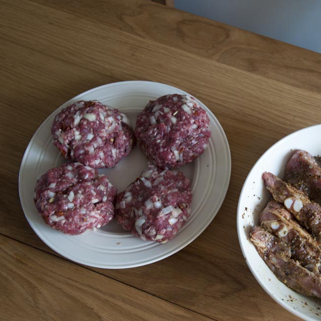 Mix all the ingredients in a bowl, mushing them together with your fingers until they combine. Then divide into four and shape by hand into thick burger patties. If you have the time to return the burgers to the fridge for an hour or so, this will just firm them up a bit and reduce the risk of them falling apart on the grill. If you’ve made more burgers than you want to eat today, interleave them with greaseproof paper before putting them in a bag, and they’ll keep in the fridge for a couple of days, or can be frozen.