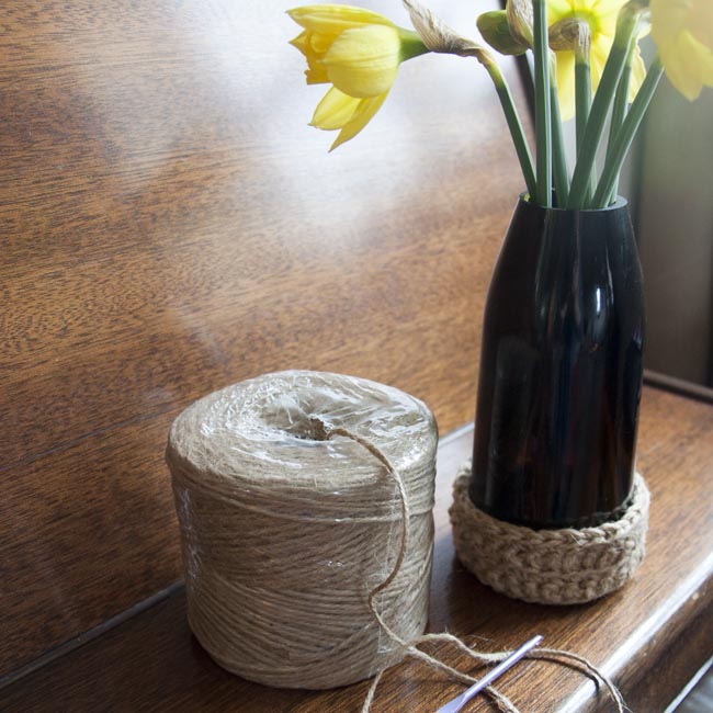 Jute basket with bottle vase Published May 12, 2013 at 650 × 650 in Easily Hooked – oops, I seem to have taken up crochet!