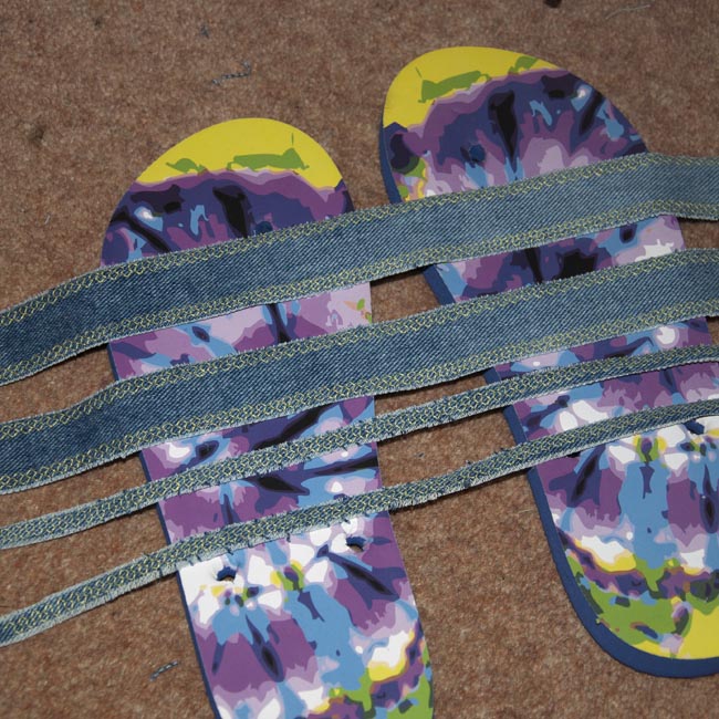 Straps complete before assembly Published June 23, 2013 at 650 × 650 in In A Flap – flip-flop denim fabric strap upcycle