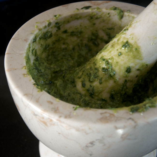 Fresh hand-made pestp Published April 28, 2014 at 650 × 650 in Pesto Pasta with Chorizo and Artichokes, from James Martin Easy Every Day – Cooking the Books, week 17