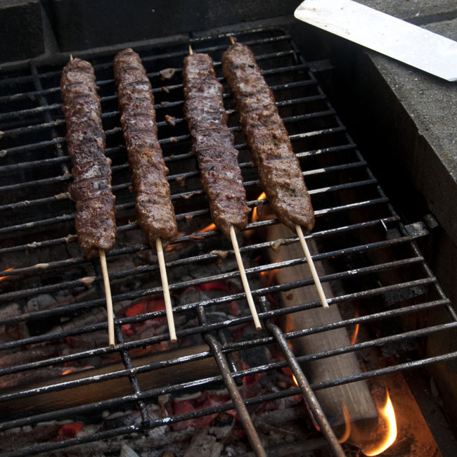 Kebabs after turning Published June 16, 2014 at 650 × 650 in Indian-Style Kebabs with Yoghurt Sauce, from The Complete BBQ Book – Cooking the Books, week 23
