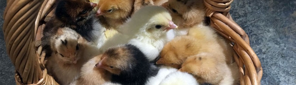 The brooder set-up is a bit ‘make do and mend’. I had bought a second hand Brinsea Eco-glow ‘electric hen’ style brooder, rather than use the more traditional hanging heat lamp, both because it has far lower energy consumption than a lamp, and because it seemed to me a more natural thing from a behavioural point of view – chicks would likely feel more comfortable and reassured by a dark warm place to snuggle under than a mysterious warm light in the sky. The brooder cage is Dave the dog’s old puppy crate, wrapped around with cling film to prevent drafts at chick height, with cardboard baffles around the edges, and bedded with newspaper and a thin layer of clean dust extracted wood shavings.