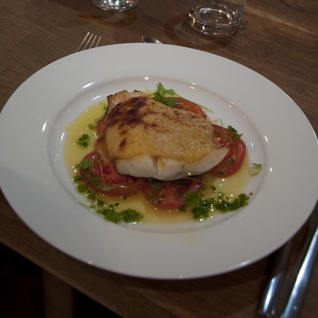 Smoked haddock rarebitSmoked haddock rarebit with confit tomatoes – An unusual twist on a Welsh rarebit, with the cheese-based layer built on top of a lovely naturally smoked haddock fillet.  Served with a confit tomato salad (which will definitely be making it into my culinary repertoire) it’s a lovely dish for an English summer’s day, balancing the clean crisp flavours of the tomatoes with the comforting warmth of smoked fish and grilled cheese.
