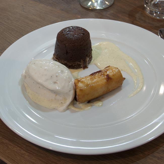 Hot chocolate mousseWarm chocolate mouse with banana ice cream & custard – The freshly made ‘last minute’ banana ice cream is actually the star of this dish for me.  It’s packed with really distinct flavours and heaps of texture.  Perhaps it’s because I’m not that much of a chocoholic – the chocolate pudding is tasty, and gooey in the middle, but very similar to things I’ve had before.  The custard involved a lot of hard work, and is clearly something I should master, but I’m not that much of a custard fan and I’m not convinced it adds that much when you already have the gorgeous banana ice cream.