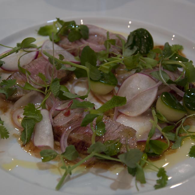 Seared tuna with 'Japanese slaw'Seared tuna in spiced apricot marinade with ‘Japanese slaw’ – A beautiful dish to look at on the plate with some lovely flavours – there’s an almost North African vibe with the fruit & spice flavours.  By this stage in the tasting I was really struggling to eat another bite, but was very glad I did.  We don’t often cook fresh tuna at home but I will certainly adapt this marinade next time we do, as it just lifts that slightly bland character it can have while letting the flavour still shine through.