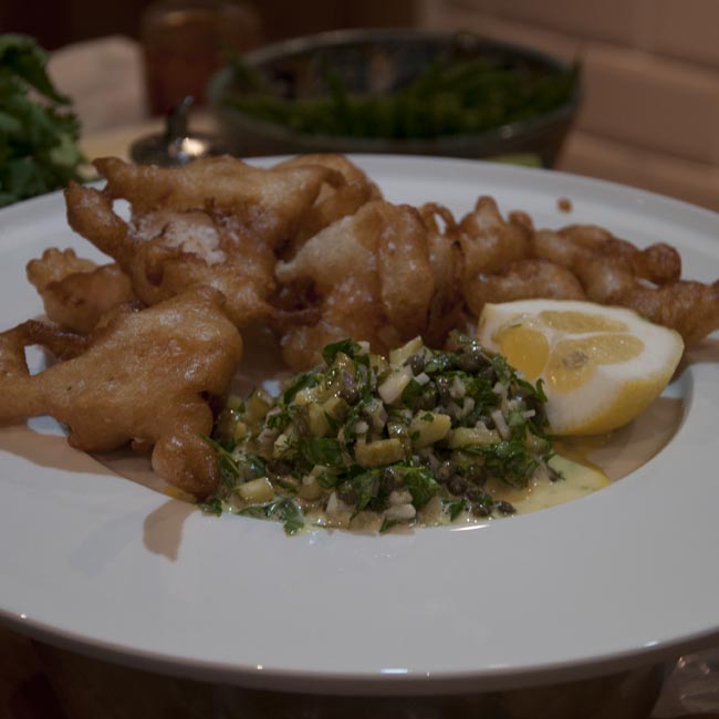 Cod cheeks with tartar sauceVodka-and-tonic battered cod cheeks with tartare sauce – The batter was an unusual concoction, with the cocktail-cupboard ingredients and made ‘live’ with yeast, quite unlike anything I’ve ever seen before.  It fries up lovely and crisp and keeps the cod cheeks gorgeous and moist.  The freshly made tartare sauce is the first such I’ve ever actually liked!  I don’t batter and deep-fry much, but it looks like a  great party-piece!  I can imagine diving into a big bowl of this with a load of friends around a table, perhaps with some slightly spiced potato wedges.