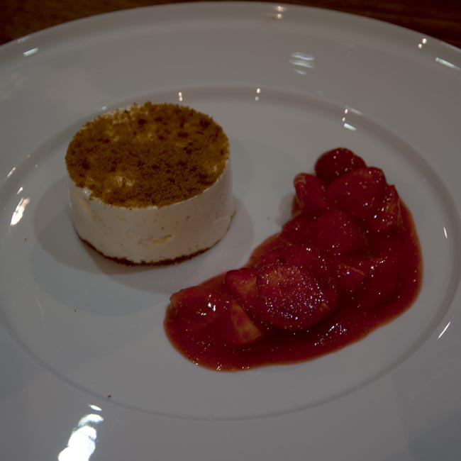 Strawberry cheesecakeStrawberry vanilla cheesecake – James introduced us to this dish, which is one that he developed for Thomas Cook‘s refreshed airline menu.  This is a wonderful quick simple & impressive little desert which you can imagine being able to adapt almost infinitely with different fruits in season and flavours in the cheesecake mix & biscuit crumb.  I particularly liked that this wasn’t an over-sweet dish, letting the flavours of the fresh English strawberries and the slightly acid-note from the cheese shine through.  It isn’t at all cloying and has an almost palate-cleansing quality, nice and fresh – just the thing when you’d eaten quite as much as we had!  All in all a great little dish and definitely another one for the repertoire!