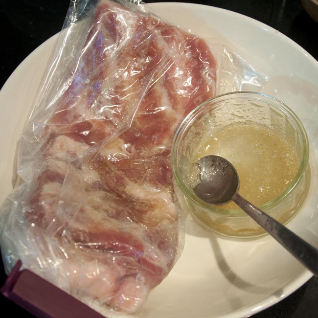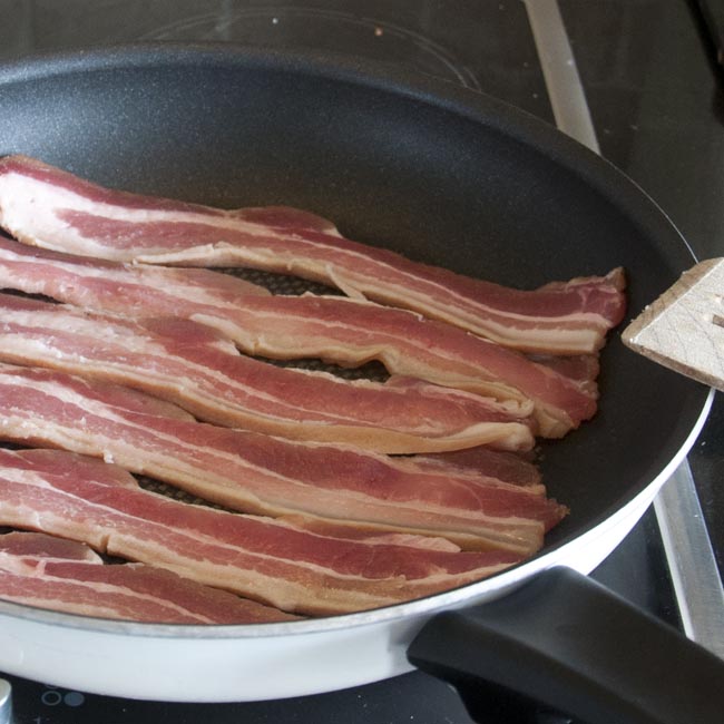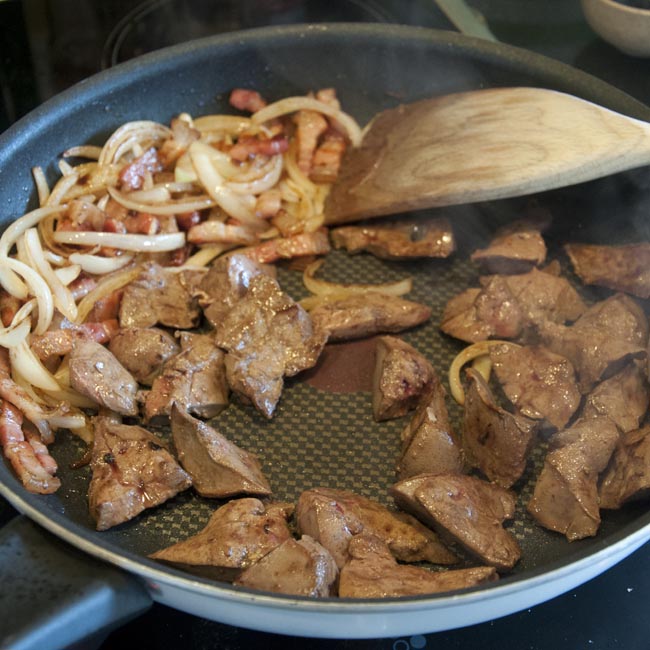 If like me you’ve forgotten to include your lardons, now is the time to fry them until golden. I used my home-cured black pepper bacon, which is lightly smoked. Incidentally, this is what really good dry-cured bacon should look like, when you’re frying it. See that lovely, clear bacon fat in the pan? That’s all that should ever leak out. And because it’s not wet, and doesn’t leach phosphate water, it fries to a beautiful golden caramelised surface. Fabulous. Once it’s cooked, set aside to cool. And try not to sample too many pieces in the name of ‘quality control, eh?