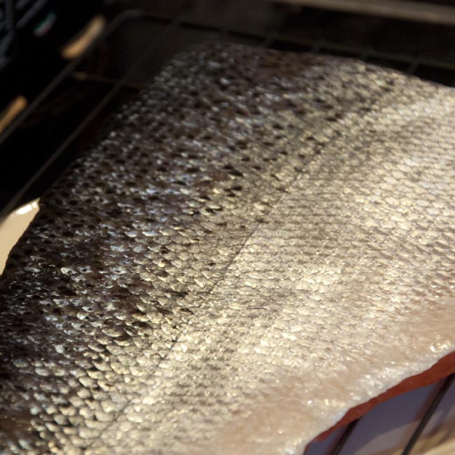 I would tend to get the cure going when I get home from work, having collected my fresh fish on the way home – so just before bed I turn the fillets over in the cure, and replace the weights before putting them back in the refrigerator. The next morning, there will be quite a lot of liquid in the dish and most of the cure will have dissolved. Take the fillets out of the dish, noting the change in texture – the skin will have taken on a harder, almost cardboard character, and the flesh will be firmer and more translucent. Rinse and dry the fillets, and weigh them again, and note down the reduction in weight. My fillets had dropped from a starting weight of 256g to 220g at this stage – a 14% water loss. You’re aiming for a final loss of ~18% by the end of the process, so that’s well on target. Now place the fillets on an open plate, uncovered, in the refrigerator for 24 hours before cold smoking.